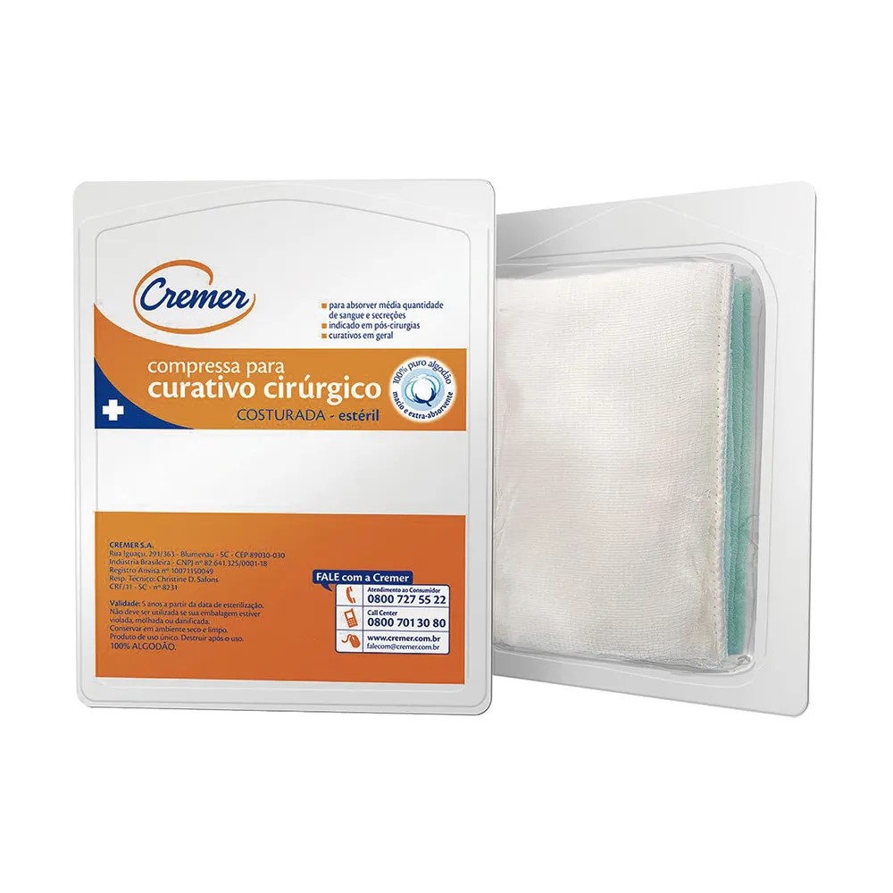 A compressa para curativo cirúrgico Cremer possui ótima absorção de fluidos. É composta por três camadas, compressa de gaze, algodão hidrófilo e algodão hidrófobo. Indicado como cobertura para feridas com médio nível de exsudação, curativos compressivos pós-cirúrgicos, queimaduras e lesões por pressão.