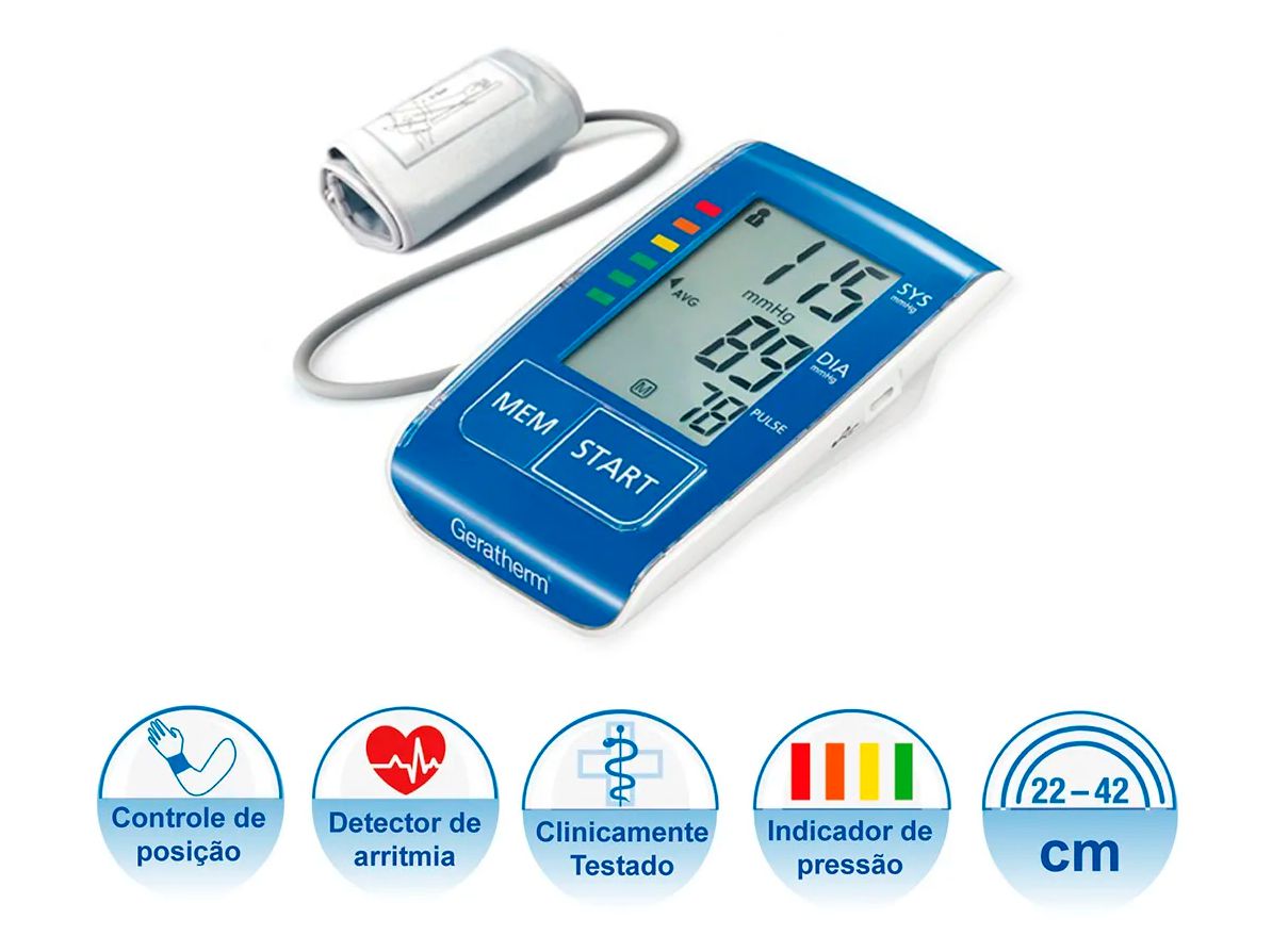O monitor de pressão Geratherm Active Control + possui tamanho ideal para o uso diário e também compacto para o transporte em caso de viagens ou locomoção. Sua nova bateria de lítio recarregáveis, fornece maior autonomia ao equipamento, atrelado com a facilidade de carregar através de um cabo USB. Os movimentos do braço e do corpo que podem levar a medições imprecisas são detectados e indicados. Silencioso, prático, preciso e com braçadeira universal para uma grande variedade de tamanhos de braço.