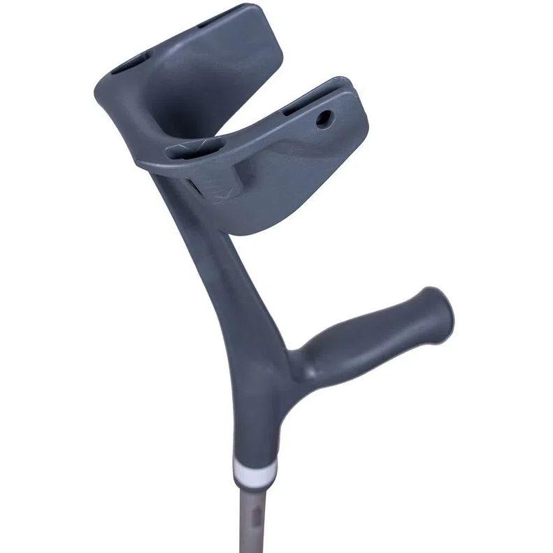 Apoio de mão (A): formato ergonômico que possibilita melhor distribuição da pressão palmar, proporcionando um apoio mais seguro e confortável durante o uso. Apoio de antebraço (B): design que acolhe o antebraço reduzindo a pressão nesta região e proporcionando conforto e segurança, tanto durante o uso da muleta quanto em repouso. Bordas superiores da braçadeira com formato anatômico (C): que possibilita melhor encaixe do antebraço, reduzindo pontos de pressão de desconforto tanto durante a caminhada quanto em repouso. Com acabamento texturizado: que diminui o atrito com a pele reduzindo desconfortos gerados pelo suor. FITA REFLETIVA Fita em 360º graus ao redor de toda braçadeira (e toda a circunferência da muleta), possibilitando uma melhor visualização do usuário e maior segurança no seu deslocamento em qualquer horário do dia.